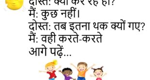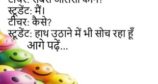टीचर: सबसे आलसी कौन?स्टूडेंट: मैं।टीचर: कैसे?स्टूडेंट: हाथ उठाने में भी सोच रहा हूँ 😴 ***************************************पत्नी: मैं कैसी लग रही हूँ?पति: कसम से…पत्नी: आगे बोलो!पति: कसम खा ली है 😄 ***************************************दोस्त: इतना खुश क्यों है?मैं: आज अलार्म नहीं बजा।दोस्त: फिर उठा कैसे?मैं: उठा ही नहीं 😆 ***************************************माँ: फोन छोड़ दे।बेटा: बस आख़िरी बार।माँ: रोज़ आख़िरी बार होता है 😑 ***************************************टीचर: होमवर्क …
