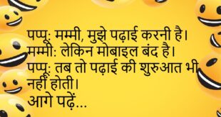 पप्पू: मम्मी, मुझे पढ़ाई करनी है।मम्मी: लेकिन मोबाइल बंद है।पप्पू: तब तो पढ़ाई की शुरुआत भी नहीं होती।😊😊😊😊 *************************************** दोस्त: तेरी वाली किसने टोक दिया?पप्पू: WiFi डाउन होने के लिए।😊😊😊😊 *************************************** टीचर: बताओ पानी क्यों जरूरी है?छात्र: सर, ताकि मोबाइल ठंडा रहे।😊😊😊😊 *************************************** पप्पू: मम्मी, मुझे गर्मी लग रही है।मम्मी: AC ऑन कर, गर्मी भी WiFi की तरह रहती है।😊😊😊😊 …