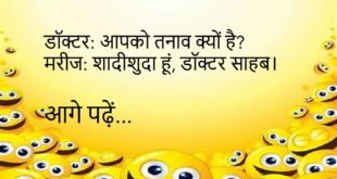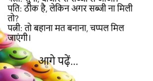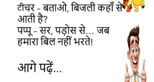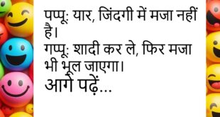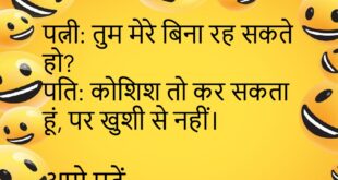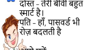 पत्नी: देखो, पड़ोसी मुझे घूर रहा है।पति: घूरने दो, मैं कब तक अकेला परेशान रहूं।😊😊😊😊😊 ******************************* पप्पू: यार, मेरी बीवी मुझे बहुत प्यार करती है।गप्पू: कैसे पता?पप्पू: लड़ाई के बाद कहती है, “तुम्हारे बिना जीना मुश्किल है”।😊😊😊😊😊 ******************************* डॉक्टर: आपको आराम की जरूरत है।मरीज: डॉक्टर साहब, आराम तो तब मिलेगा जब बीवी मायके जाएगी।😊😊😊😊😊 ******************************* टीचर: बेटा, बड़े होकर क्या …