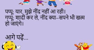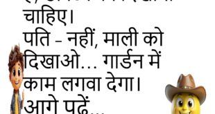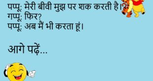 पप्पू: यार, मेरी वाईफ बोलती है मैं स्मार्ट हूं।गप्पू: हां, क्योंकि झूठ बोलना औरतों की आदत है।😊😊😊😊😊 ******************************* डॉक्टर: आपको ज्यादा काम नहीं करना चाहिए।मरीज: डॉक्टर साहब, मैं तो वैसे भी काम नहीं करता।😊😊😊😊😊 ******************************* टीचर: बेटा, तुम्हारा होमवर्क कहां है?पप्पू: सर, वाईफ ने कहा था आज आराम करना है।😊😊😊😊😊 ******************************* पत्नी: तुम मुझसे झूठ बोल रहे हो!पति: हां, लेकिन …