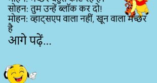 पति: सुनो, खाना दो। पत्नी: मूड नहीं है। पति: फिर तुमसे शादी करने का मेरा मूड कैसे बन गया था?😂😂😂😂😂 ********************************* बॉस: लेट क्यों आए? कर्मचारी: सपना सच्चा हो गया! बॉस: क्या सपना? कर्मचारी: सपना देखा था कि ऑफिस लेट पहुंचा हूं!😂😂😂😂😂 ********************************* मोहन: मच्छर बहुत काट रहे हैं। सोहन: तुम उन्हें ब्लॉक कर दो! मोहन: व्हाट्सएप वाला नहीं, खून …