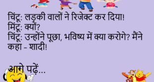 राजू: मुझे नौकरी करनी है। मैनेजर: क्या कर सकते हो? राजू: शादी के बाद भी खुश रह सकता हूं! मैनेजर: कमाल है! आप सीधा बॉस बनो!😊😊😊😊😊😊 ************************************************* पप्पू: प्यार अंधा होता है। गप्पू: शादी आंखें खोल देती है। पप्पू: फिर तलाक चश्मा बनवा देता है!😊😊😊😊😊😊 ************************************************* मोनू: मम्मी, पड़ोस वाले अंकल मुझे मारते हैं! मम्मी: क्यों बेटा? मोनू: क्योंकि मैं …