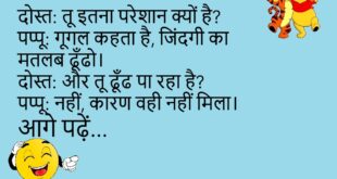 दोस्त: तू इतना परेशान क्यों है?पप्पू: गूगल कहता है, जिंदगी का मतलब ढूँढो।दोस्त: और तू ढूँढ पा रहा है?पप्पू: नहीं, कारण वही नहीं मिला।😊😊😊😊 *************************************** पप्पू: मम्मी, ये बिस्किट तो कड़वा है।मम्मी: क्योंकि उसके ऊपर एक्स्ट्रा प्यार लगाया है।😊😊😊😊 *************************************** बॉस: कल ऑफिस देर क्यों हुई?कर्मचारी: सर, ट्रैफिक जाम में फंस गया।बॉस: फिर रास्ता बदल क्यों नहीं लिया?कर्मचारी: रास्ता बदलने …