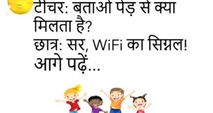 पप्पू: मम्मी, मुझे नींद नहीं आ रही।मम्मी: मोबाइल रखो, WiFi भी सो जाएगा।😊😊😊😊 *************************************** टीचर: बताओ पेड़ से क्या मिलता है?छात्र: सर, WiFi का सिग्नल!😊😊😊😊 *************************************** पप्पू: मम्मी, मुझे खाना चाहिए।मम्मी: पहले WiFi चार्ज कर लो।😊😊😊😊 *************************************** दोस्त: तेरी कार क्यों नहीं स्टार्ट हुई?पप्पू: पेट्रोल में WiFi डाली थी।😊😊😊😊 *************************************** बॉस: मीटिंग क्यों मिस हुई?कर्मचारी: सर, Outlook भी सो रहा …