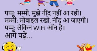 पप्पू: मम्मी, मुझे नींद नहीं आ रही।मम्मी: मोबाइल रखो, नींद आ जाएगी।पप्पू: लेकिन WiFi ऑन है।😊😊😊😊 *************************************** दोस्त: यार, तेरी जेब खाली क्यों है?पप्पू: WiFi के पैसे खर्च हो गए।😊😊😊😊 *************************************** टीचर: सूरज की रोशनी क्यों जरूरी है?छात्र: ताकि मोबाइल चार्ज हो सके।😊😊😊😊 *************************************** पप्पू: मम्मी, मुझे भूख लगी।मम्मी: ऑनलाइन ऑर्डर कर लो।😊😊😊😊 *************************************** बॉस: प्रेजेंटेशन तैयार है?कर्मचारी: सर, स्लाइड्स …