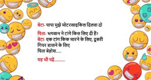 बहू- मैं आपकी घर के काम में मदद करूं मांजी सास- क्यों बहू, तेरा नेट खत्म हो गया है क्या? जवाब सुनकर बहू की बोलती बंद हो गई……😆🤣🤣🤣🤣😝😝😝 ************************************************************************************ सास (बहू से)- मैं भगवान को बहुत याद करती हूं बहू- जरुरत से ज्यादा भगवान को मत याद किया करो मांजी, क्योंकि जिस दिन भगवान ने याद कर लिया तो लेने …