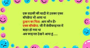 शादी के मंडप में दूल्हा रोमांटिक अंदाज में दूल्हन से बोला… मे आई किस यू डार्लिंग? तो दुल्हन शर्माते हुए बोली-हमने तो कभी गैरों को भी मना नहीं किया, आप तो फिर भी अपने हो…😆🤣🤣🤣🤣😝😝😝 ************************************************************************************ टीचर (स्टूडेंट से)- आज तुमने देर से आने का क्या बहाना ढूंढा? छात्र- मैडम आज मैं इतना तेज दौड़कर आया कि बहाना सोचने का …