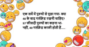 गर्लफ्रेंड- मेरी एक-एक सांस पर हजारों लड़के मरते हैं ब्वॉयफ्रेंड- थोड़ा टाइम निकाल कर ब्रश कर लिया करो, हजारों मासूमों की जान बच जाएगी…😆🤣🤣🤣🤣😝😝😝 ************************************************************************************ शादी एक ऐसा दिन है जब लड़का स्टेज पर अपनी दुल्हन के साथ बैठे हुए दूसरी लड़कियों को देखकर सोचता है अचानक इतनी सुंदर लड़कियां कहां से आ गईं, आज से पहले कहां मर गई …