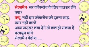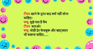 गप्पू- आज मैने मौत को बहुत ही करीब से देखा पप्पू- वो कैसे? गप्पू- दो लड़कियां बगैर मेकअप के जा रही थीं…….😆🤣🤣🤣🤣😝😝😝 ************************************************************************************* पिंकी (चिंटू से)- क्या लोगे हलवा या खीर? चिंटू- तेरे घर में एक ही कटोरी है क्या……😆🤣🤣🤣🤣😝😝😝 ************************************************************************************* टीचर- चांद पर पहला कदम रखने वाले व्यक्ति का नाम बताओ? मिंटू- नील आर्मस्ट्रांग टीचर- फिर दूसरा कदम किसने …
