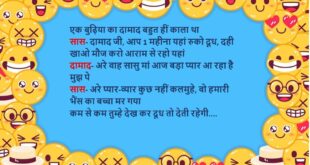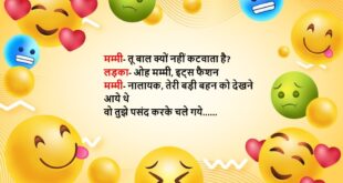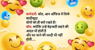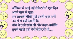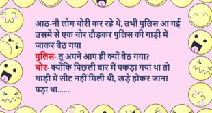 गोलू पुलिस स्टेशन जा कर बोला- मुझे फोन पर जान से मारने की धमकी मिल रही है इंस्पेक्टर- कौन दे रहा है? गोलू- बिजली वाले कह कह रहे हैं, बिल नहीं भरा तो काट देंगे……😆🤣🤣🤣🤣😝😝😝 ************************************************************************************* आठ-नौ लोग चोरी कर रहे थे, तभी पुलिस आ गई उसमे से एक चोर दौड़कर पुलिस की गाड़ी में जाकर बैठ गया पुलिस- तू …