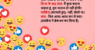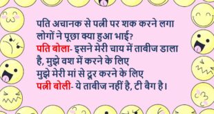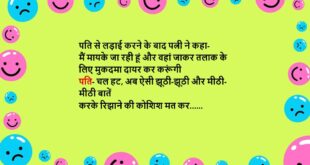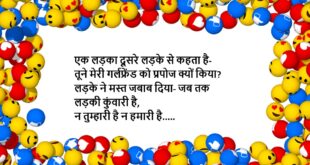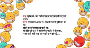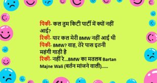 रिंकी- शादी की सारी तैयारियां कर ली क्या? पिंकी- हां दोनों सिम नाले में फेंक दिया, फोन को फार्मेट कर दिया है, फेसबुक और इंस्टाग्राम आईडी permanent deactivate कर दी है बस तू अपना मुंह बंद रखीयो…….😆🤣🤣🤣🤣😝😝😝 ************************************************************************************* पिंकी- कल तुम किटी पार्टी में क्यों नहीं आई? रिंकी- यार कल मेरी BMW नहीं आई थी पिंकी- BMW? वाह, तेरे पास …