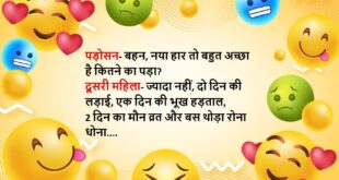 टीचर- आज मैं Noun पढ़ाऊंगी पप्पू तुम खड़े हो जाओ पप्पू- जी मैडम टीचर- लड़की सबसे हंस के बात करती है, इसमें लड़की क्या है? पप्पू- जी लड़की बिगड़ी हुई है, सबसे सेटिंग करना चाहती है…..😆🤣🤣🤣🤣😝😝😝 ******************************************************************************************** पड़ोसन- बहन, नया हार तो बहुत अच्छा है कितने का पड़ा? दूसरी महिला- ज्यादा नहीं, दो दिन की लड़ाई, एक दिन की भूख …
