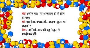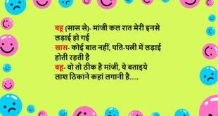 देवर- आप बहुत सुंदर हो आप तो एकदम रानी जैसी हो भाभी- अरे, सच में क्या? देवर- जी, भाभी जी भाभी- और बताओ क्या कर रहे हो अभी? देवर- मजाक…….😆🤣🤣🤣🤣😝😝😝 ******************************************************************************************** लड़का (लड़की से)- कल रात को क्या खाया था? लड़की- बर्गर, पिज्जा और कोक लड़का- देखो ये फेसबुक नहीं है, सच बताओ लड़की- बासी रोटी और टिंडे की सब्जी…😆🤣🤣🤣🤣😝😝😝 …