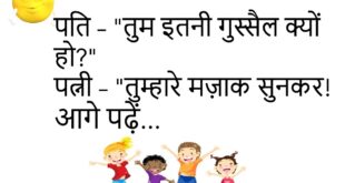 मम्मी – “इतनी मिठाई क्यों खाई?”बच्चा – “आज मेरी खुशी का दिन है।”😊😊😊😊 **************************************** टीचर – “इतना होशियार कैसे हो?”छात्र – “होशियार तो हूँ, बस पढ़ाई कम कर दी।”😊😊😊😊 **************************************** दोस्त – “तुम गाना सुनते हो या गाते हो?”दोस्त 2 – “सुनता हूँ।”दोस्त – “गाते समय भी सुनते हो?”😊😊😊😊 **************************************** पति – “तुम बहुत बदल गई हो।”पत्नी – “नजर बदल …