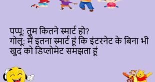 गोलू: मैं इतना स्मार्ट हूं कि बिना चश्मे के भी चीजें देख सकता हूं। पप्पू: अगर तुम स्मार्ट हो, तो बिना अकल के भी क्यों चलते हो?😊😊😊😊😊 *********************************************** पति: तुम हमेशा मोबाइल में क्यों लगी रहती हो? पत्नी: मैं तुम्हारे बारे में गूगल कर रही हूं। पति: क्या ढूंढ रही हो? पत्नी: “कैसे बदलें रिश्ते को और बेहतर?”😊😊😊😊😊 *********************************************** पप्पू: …