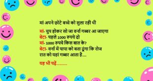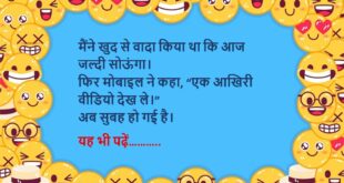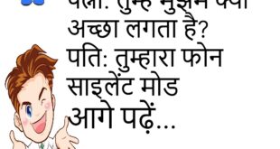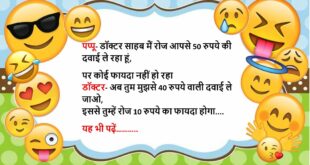 राजू: मेरी पत्नी कहती है कि मैं बहुत फिजूलखर्च हूं। मोहन: फिर क्या हुआ। राजू: फिर क्या… महंगे गिफ्ट लेकर तुरंत सुलह कर ली।😆🤣🤣🤣🤣😝😝😝 ************************************************************************************ मरीज: डॉक्टर साहब, मुझे रात को नींद नहीं आती। डॉक्टर: सोने से पहले मोबाइल बंद कर दिया करो। मरीज: अरे डॉक्टर साहब, फिर नींद आएगी ही क्यों।😆🤣🤣🤣🤣😝😝😝 ************************************************************************************ अमन: मेरे पास एक अच्छी खबर है …