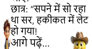 टीचर: “इतना लेट क्यों आए?” छात्र: “सपने में सो रहा था सर, हकीकत में लेट हो गया!”😊😊😊😊 ****************************************** पप्पू: “मेरी बीवी मुझसे बहुत प्यार करती है।” दोस्त: “क्यों?” पप्पू: “क्योंकि वो मुझसे रोज लड़ती है।”😊😊😊😊 ****************************************** मरीज: “डॉक्टर साहब, मुझे भूलने की बीमारी हो गई है।” डॉक्टर: “कब से?” मरीज: “कब से क्या?”😊😊😊😊 ****************************************** बॉस: “तुम काम क्यों नहीं कर …