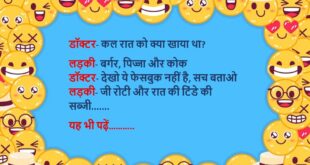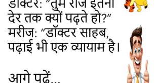 डॉक्टर: “तुम रोज इतनी देर तक क्यों पढ़ते हो?” मरीज: “डॉक्टर साहब, पढ़ाई भी एक व्यायाम है।”😊😊😊😊 ****************************************** बॉस: “तुम्हारी रिपोर्ट देर से क्यों आई?” कर्मचारी: “सर, रिपोर्ट भी ट्रैफिक में फंस गई थी।”😊😊😊😊 ****************************************** पत्नी: “तुम मुझसे प्यार करते हो?” पति: “हां।” पत्नी: “कितना?” पति: “जितना तुम्हारे मेकअप की कीमत है।”😊😊😊😊 ****************************************** दोस्त: “तुम्हारा सपना क्या है?” पप्पू: “सोने …
