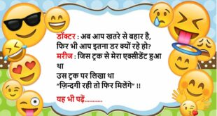 बॉस: “क्यों लेट आए?” कर्मचारी: “सपने में ऑफिस आया था सर, असली में लेट हो गया।”😊😊😊😊 ****************************************** डॉक्टर: “तुम रोज इतनी देर तक क्यों पढ़ते हो?” मरीज: “डॉक्टर साहब, पढ़ाई भी एक व्यायाम है।”😊😊😊😊 ****************************************** पप्पू: “मुझे भूलने की बीमारी हो गई है।” गप्पू: “कब से?” पप्पू: “कब से क्या?”😊😊😊😊 ****************************************** पत्नी: “तुम हमेशा मोबाइल में लगे रहते हो।” पति: …
