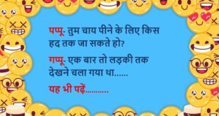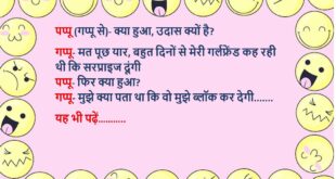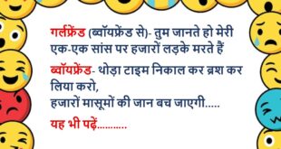 अंकल- क्यों बेटे किस खानदान से हो? पप्पू- जानवरों के खानदान से अंकल- मतलब पप्पू- मेरे पिताजी मुझे गधा, मम्मी कुत्ता, बहन बंदर, टीचर सूअर और दादाजी मुझे बब्बर शेर कहते हैं……😆🤣🤣🤣🤣😝😝😝 ************************************************************************************ पप्पू (गप्पू से)- सच्चा प्यार तो बस लड़के करते हैं इसलिए प्यार का भूत होता है, भूतनी नहीं…….😆🤣🤣🤣🤣😝😝😝 ************************************************************************************ लड़का- तुम्हें मेरे अंदर सबसे अच्छी बात क्या …