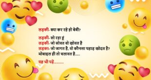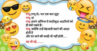 ससुर (दामाद से)- शादी के पहले तो तुम बहुत उपवास रखते थे दामाद- हां, सावन के सोमवार रखता था ससुर- तो अब क्या हुआ? दामाद- फिर आपकी बेटी से शादी हो गई और मेरा उपवास पर से भरोसा ही उठ गया……😆🤣🤣🤣🤣😝😝😝 ************************************************************************************ एक लड़के ने एक खूबसूरत लड़की से पुछा, आप कहां रहती हो? लड़की ने जवाब दिया- एम जी …