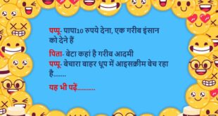 एक बच्चा अपने पड़ोस में जाकर दरवाजे की घंटी बजाता है महिला दरवाजा खोलकर कहती है- बेटा क्या हुआ? बच्चा- आंटी मम्मी ने एक कटोरी चीनी मंगाई है महिला (मुस्कुरा कर)- अच्छा और क्या कहा तेरी मम्मी ने? बच्चा- कहा है कि….अगर वो डायन न दे तो सामने वाली चुड़ैल से ले आना…..😆🤣🤣🤣🤣😝😝😝 ************************************************************************************ राजू- डॉक्टर साहब, मैं बहुत खुश …