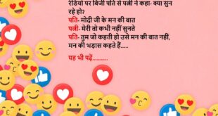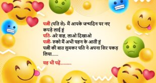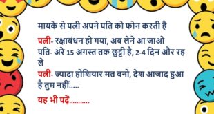 पति से लड़ाई करती पत्नी ने खाया जहर पति-पत्नी के बीच लड़ाई हुई पत्नी बाजार जाके जहर लाई और खा लिया! लेकिन वो मरी नहीं बल्कि बीमार पड़ गई पति गुस्से से बोला – 100 बार कहा है कि, चीजें देख कर खरीदा करो, अब पैसे भी गए और काम भी नहीं हुआ……😆🤣🤣🤣🤣😝😝😝 ************************************************************************************ पत्नी के मायके से वापस आते …
