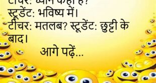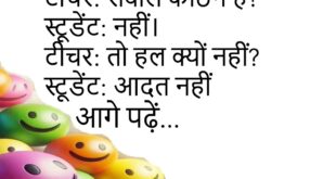 टीचर: ध्यान कहाँ है? स्टूडेंट: भविष्य में। टीचर: मतलब? स्टूडेंट: छुट्टी के बाद।😊😊😊😊 ************************************** दोस्त: इतना खुश क्यों है? लड़का: सैलरी आई है। दोस्त: खर्च? लड़का: अभी शॉक में है।😊😊😊😊 ************************************** दोस्त: जिम क्यों जॉइन किया? लड़का: फोटो अच्छी आएगी। दोस्त: सेहत? लड़का: फिल्टर संभाल लेगा।😊😊😊😊 ************************************** मां: सब्जी क्यों नहीं खा रहा? बेटा: उसमें विटामिन नहीं दिख रहा। मां: …