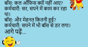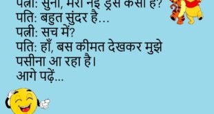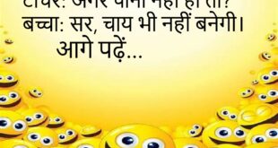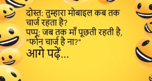 टीचर: अगर पानी नहीं हो तो?बच्चा: सर, चाय भी नहीं बनेगी।😊😊😊😊 ***************************************** लड़का: तुम मेरी जिंदगी में मिठास हो।लड़की: अच्छा!लड़का: पर मुझे भूलने वाली मिठास पसंद नहीं।😊😊😊😊 ***************************************** पप्पू: डॉक्टर साहब, मुझे नींद नहीं आती।डॉक्टर: क्यों?पप्पू: सर, रात में फोन का अलार्म बजता है।😊😊😊😊 ***************************************** पत्नी: सुनिए, मैं सुंदर हूँ या नहीं?पति: हाँ, बहुत सुंदर।पत्नी: सच में?पति: हाँ, जब मम्मी …