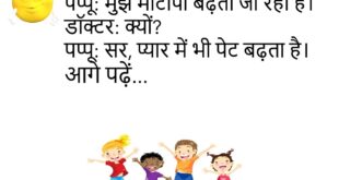 पप्पू: मुझे मोटापा बढ़ता जा रहा है।डॉक्टर: क्यों?पप्पू: सर, प्यार में भी पेट बढ़ता है।😊😊😊😊 ***************************************** टीचर: बताओ, सबसे बड़ा शहर कौन सा है?बच्चा: सर, पेट का शहर, जब भूख लगी हो।😊😊😊😊 ***************************************** पति: तुम हमेशा मुझसे लड़ती क्यों रहती हो?पत्नी: क्योंकि तुम्हारी आदतें लाजवाब हैं।😊😊😊😊 ***************************************** पप्पू: मुझे कोई नौकरी नहीं मिल रही।दोस्त: क्यों?पप्पू: सर, जॉब देने वाले भी …