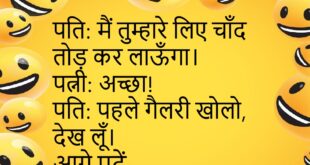 पति: मैं तुम्हारे लिए चाँद तोड़ कर लाऊँगा।पत्नी: अच्छा!पति: पहले गैलरी खोलो, देख लूँ।😊😊😊😊 ***************************************** पप्पू: मुझे सपना आया कि मैं क्रिकेटर बन गया।दोस्त: और?पप्पू: उठकर देखा, बैट वॉलेट में था।😊😊😊😊 ***************************************** बच्चा: पापा, मुझे कहानी सुनाओ।पापा: कौन सी?बच्चा: घर की कहानी।😊😊😊😊 ***************************************** मम्मी: तुमने स्कूल का होमवर्क किया?बच्चा: नहीं मम्मी, किताबें ऑनलाइन पढ़ने में लगी थीं।😊😊😊😊 ***************************************** पप्पू: मुझे …