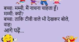 बच्चा: मम्मी, मैं नाचना चाहता हूँ।मम्मी: क्यों?बच्चा: ताकि टीवी वाले भी देखकर बोले, वाह!😊😊😊😊 ***************************************** दोस्त: तुम स्कूल क्यों नहीं गए?पप्पू: सर, छुट्टी थी।दोस्त: कौन सी छुट्टी?पप्पू: स्कूल से!😊😊😊😊 ***************************************** टीचर: बताओ, कौन सी चीज़ हमेशा बढ़ती है?बच्चा: सर, भूख!😊😊😊😊 ***************************************** पति: तुम्हारे लिए कुछ करूँ?पत्नी: हाँ, खाना खा लो।😊😊😊😊 ***************************************** पप्पू: मुझे नौकरी चाहिए।दोस्त: किस क्षेत्र में?पप्पू: हँसी का, …
