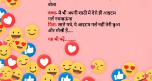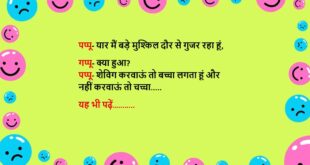 पिता- क्या बात बेटा, आज बड़े खुश हो पप्पू- आपने कहा था न की मेहनत इतनी खामोशी से करो की सफलता शोर मचाए पिता- हां पप्पू- मेरी गर्लफ्रेंड को बेटा हुआ है सुनकर पिता बेहोश…..😆🤣🤣🤣🤣😝😝😝 ************************************************************************************ चिंटू अपनी शादी में पंडित जी से बोला- दुल्हन के बाईं ओर बैठना है या फिर दाईं ओर? पंडित- अभी तो कहीं भी बैठ …