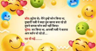पत्नी- अजी सुनते हो, खुशनसीब को इंग्लिश में क्या कहते हैं? पति- अनमैरिड😆🤣🤣🤣🤣😝😝😝 ************************************************************************************ बीमार पति को डॉक्टर के पास ले गई पत्नी डॉक्टर- इनको अच्छा खाना दो, हमेशा खुश रखो, घर की कोई भी प्रॉब्लम इनसे डिस्कस मत करो, फालतू की फरमाइशें मत करो ताकि इनकी चिंताएं न बढ़ें अगर ऐसा किया तो ये 6 महीने में ठीक हो …