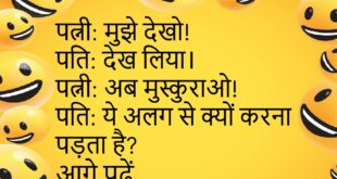 पत्नी: खाना कैसा है?पति: अच्छा है।पत्नी: मतलब सच बताओ!पति: अच्छा ही है।पत्नी: अभी आया मेरा बेलन!😊😊😊😊 ********************************************** बॉस: काम क्यों नहीं कर रहे?कर्मचारी: सर, कंप्यूटर hang हो गया।बॉस: फिर?कर्मचारी: मैंने भी साथ में break ले लिया।😊😊😊😊 ********************************************** बेटा: पापा, शादी कैसी होती है?पापा: बेटा, पहले मिठाई… फिर कड़वी गोलियाँ।😊😊😊😊 ********************************************** पत्नी: तुम मुझसे कितना प्यार करते हो?पति: उतना जितना तुम्हारी …