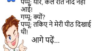 पत्नी: मुझे फरिश्ता समझो!पति: हाँ, क्योंकि तुम्हारे आने के बाद मेरी जिंदगी उड़ गई!😊😊😊😊 ********************************************** टीचर: तुम रोज लेट क्यों आते हो?बच्चा: क्योंकि जल्दी उठने की आदत नहीं है।😊😊😊😊 ********************************************** डॉक्टर: क्या तकलीफ़ है?मरीज: बीवी बिना वजह डाँटती है।डॉक्टर: यह तो राष्ट्रीय समस्या है।😊😊😊😊 ********************************************** पप्पू: यार, कल रात नींद नहीं आई!गप्पू: क्यों?पप्पू: तकिए ने मेरी पीठ दिखाई थी!😊😊😊😊 ********************************************** …