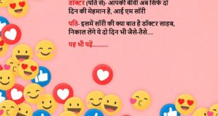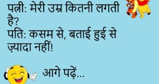 टीचर: बताओ, शादी क्या है?बच्चा: सर, वही जो नींद में भी जगा देती है!😊😊😊😊 ********************************************** पत्नी: मेरी उम्र कितनी लगती है?पति: कसम से, बताई हुई से ज़्यादा नहीं!😊😊😊😊 ********************************************** डॉक्टर: क्या समस्या है?मरीज: बीवी बात नहीं कर रही।डॉक्टर: बधाई हो, ये बीमारी नहीं, नेमत है।😊😊😊😊 ********************************************** पप्पू: मेरी गर्लफ्रेंड ने कहा– “Space दो!”गप्पू: फिर?पप्पू: मैंने NASA का link भेज दिया।😊😊😊😊 …