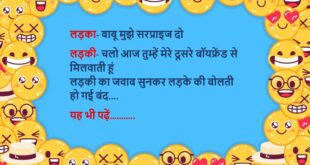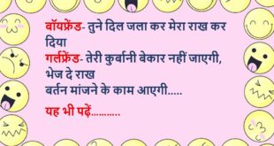 पप्पू जब भी कपड़े धोता, तभी बारिश हो जाती…! . एक दिन धूप निकली तो वो खुश हुआ और दुकान पर सर्फ लेने चला गया…! . वो जैसे ही दुकान पर गया, बादल जोर-जोर से गरजने लगे…! . पप्पू आसमान की तरफ मुंह करके बोला – क्या? किधर? मैं तो बिस्कुट लेने आया हूं…!😆🤣🤣🤣🤣😝😝😝 ************************************************************************************ प्रेमी – मैं उस लड़की …