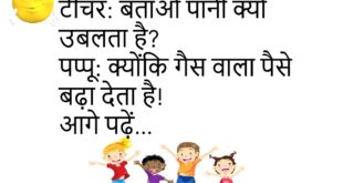 टीचर: बताओ पानी क्यों उबलता है? पप्पू: क्योंकि गैस वाला पैसे बढ़ा देता है!😊😊😊😊 ***************************************** डॉक्टर: आपको आराम की ज़रूरत है। मरीज: पर मुझे तो नींद नहीं आती! डॉक्टर: हम बिल भेज देंगे, अपने-आप नींद आ जाएगी!😊😊😊😊 ***************************************** पति: तुम मुझसे नाराज़ क्यों हो? पत्नी: क्योंकि मुझे वजह याद नहीं, लेकिन तुम ज़रूर गलत हो!😊😊😊😊 ***************************************** पप्पू: यार मेरी लाइफ …