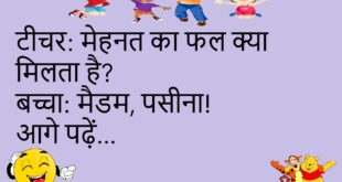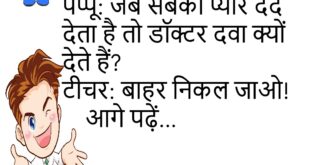 पप्पू: जब सबको प्यार दर्द देता है तो डॉक्टर दवा क्यों देते हैं? टीचर: बाहर निकल जाओ!😊😊😊😊 ***************************************** बच्चा: मम्मी, मैं बड़ा होकर गुंडा बनूंगा। मम्मी: बेटा, अच्छे घरों के लोग नेता बनते हैं!😊😊😊😊 ***************************************** टीचर: तुम रोज लेट क्यों आते हो? छात्र: क्योंकि समय से आना अच्छी आदत है, और मैं अभी बच्चा हूं।😊😊😊😊 ***************************************** पति: तुम मुझसे कितना …