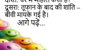 लड़की: तुम मुझसे शादी क्यों करना चाहते हो?लड़का: क्योंकि तुम सवाल बहुत पूछती हो, और मेरी आदत है चुप रहने की!😊😊😊😊 ***************************************** मरीज: डॉक्टर साहब, पेट में दर्द है।डॉक्टर: क्या खाया था?मरीज: बीवी की बातें।😊😊😊😊 ***************************************** दोस्त: घर में माहौल कैसा है?दूसरा: तूफान के बाद की शांति — बीवी मायके गई है।😊😊😊😊 ***************************************** टीचर: अगर पृथ्वी गोल है, तो हम …