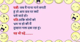 पत्नी: मैं तुमसे बहुत नाराज़ हूँ। पति: चलो अच्छा है, किचन साफ़ हो जाएगा।😊😊😊😊 ***************************************** दोस्त: मेरा कुत्ता बहुत स्मार्ट है। दूसरा: कैसे? दोस्त: मुझे देखकर भौंकता नहीं!😊😊😊😊 ***************************************** टीचर: बताओ, दिमाग कहाँ होता है? बच्चा: सर, जहाँ आपकी कॉपी चेक करते वक्त रहता है—कहीं और!😊😊😊😊 ***************************************** पत्नी: मेरी इज्जत घर में नहीं है। पति: बाहर चलो, देखते हैं वहाँ …