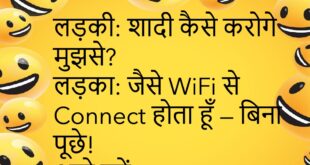 दोस्त: भाई, Crush Reply दे रही है? दूसरा: हाँ, बस Emoji से मार रही है! 😂 ************************************** पिता: क्यों सो रहे हो? बेटा: Battery Low थी — Charging Mode में हूँ! 😆 ************************************** लड़की: दुनिया में कौन-सा रिश्ता सबसे Strong है? लड़का: WiFi + Password वाला! 🤣 ************************************** पत्नी: मेरे साथ टाइम स्पेंड करो! पति: Update आने दो — फिर …