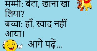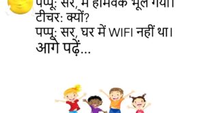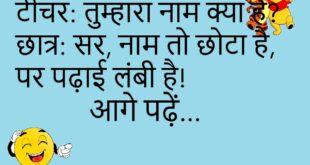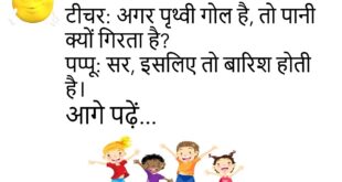 दोस्त: तुम्हें कौन सा फल पसंद है? दोस्त 2: आलू! दोस्त 1: आलू फल नहीं है। दोस्त 2: जो मुझे पसंद हो वही फल है!😊😊😊😊😊 ****************************************** पापा: बेटा, तुम क्यों चुप हो? बेटा: पापा, मैं आपकी बातें सुन रहा हूँ। पापा: अच्छा, फिर तो चुप रहो।😊😊😊😊😊 ****************************************** मम्मी: बेटा, दूध पी लिया? बच्चा: हाँ मम्मी, पहले मैंने चाय पी थी। …