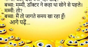 बच्चा: मम्मी, मैं स्कूल नहीं जाऊँगा। मम्मी: क्यों? बच्चा: वहाँ सोना मना है।😊😊😊😊😊 ****************************************** पापा: बेटा, होमवर्क किया? बेटा: हाँ, कल कर लूँगा।😊😊😊😊😊 ****************************************** डॉक्टर: बीपी बढ़ गया है। मरीज़: सर, बीवी की बातें सुनकर।😊😊😊😊😊 ****************************************** दोस्त: शादी क्यों नहीं की? दोस्त 2: फ्री WiFi नहीं है।😊😊😊😊😊 ****************************************** मम्मी: बेटा, खाना खा लिया? बच्चा: हाँ, स्वाद नहीं आया।😊😊😊😊😊