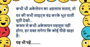 पत्नी के मायके से वापस आते ही दरवाजा खोलते ही हंसने लगा पति पत्नी- ऐसे क्यों हंस रहे हो? पति- गुरुजी ने कहा था कि जब भी मुसीबत आए, तो उसका सामना हंसते हुए करना…..😆🤣🤣🤣🤣😝😝😝 ************************************************************************************ पत्नी- आपको पता है, 40 के बाद स्त्रियां समझदार हो जाती हैं पति- पर वो अपने आप को 40 की मानें तब न……😆🤣🤣🤣🤣😝😝😝 ************************************************************************************ …