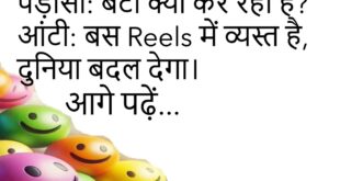 पति: मैं तुम्हारे लिए तारे तोड़ लाऊंगा! पत्नी: पहले घर की LED ही ठीक कर दो।😊😊😊😊 ******************************************* दोस्त: तू आजकल घूमता नहीं? दूसरा: क्या करूँ, Google Maps खुद थक गया।😊😊😊😊 ******************************************* पत्नी: सुनो, कल से डाइटिंग! पति: ठीक है, कल से… कल कभी आता ही नहीं।😊😊😊😊 ******************************************* पड़ोसी: बेटा क्या कर रहा है? आंटी: बस Reels में व्यस्त है, दुनिया …