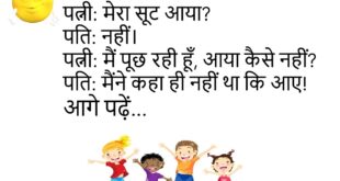 पत्नी: मेरा सूट आया? पति: नहीं। पत्नी: मैं पूछ रही हूँ, आया कैसे नहीं? पति: मैंने कहा ही नहीं था कि आए!😊😊😊😊 *************************************** बच्चा: डैड, आप कितने साल के हो? डैड: 40। बच्चा: और मम्मी? डैड: 35। बच्चा: तो फिर मैं 10 का कैसे? डैड: सिस्टम डाउन था उस दिन!😊😊😊😊 *************************************** पप्पू: मम्मी खाना दो। मम्मी: हाथ धोए? पप्पू: नहीं, …
