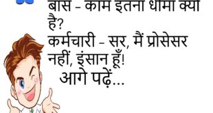 बॉस – काम इतना धीमा क्यों है? कर्मचारी – सर, मैं प्रोसेसर नहीं, इंसान हूँ!😊😊😊😊 *********************************************** पत्नी – मेरे बाल झड़ रहे हैं! पति – चलो, अब कम से कम झगड़ा करते वक्त पकड़ नहीं पाओगी!😊😊😊😊 *********************************************** पप्पू – मुझे एक ऐसी बीवी चाहिए जो गाना गाए! दोस्त – फिर तो पड़ोसी को तलाक दे दो पहले!😊😊😊😊 *********************************************** मम्मी – …