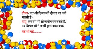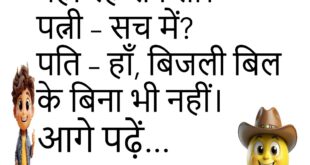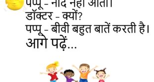 टीचर – पानी का रंग?बच्चा – जो गीला करता है।😊😊😊😊 *********************************** पप्पू – स्कूल नहीं जाना।मम्मी – क्यों?पप्पू – पढ़ाई नहीं करनी।😊😊😊😊 *********************************** पति – बिना तुम्हारे नहीं रह सकता।पत्नी – अच्छा?पति – बिजली बिल के बिना भी नहीं।😊😊😊😊 *********************************** पप्पू – नींद नहीं आती।डॉक्टर – क्यों?पप्पू – बीवी बहुत बातें करती है।😊😊😊😊 *********************************** बबलू – शादी के बाद इंसान …